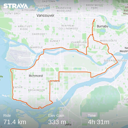 Walk over to my local gym. Do my typical 20 minute cardio of some kind to warm up (ride the exercise bike on rolling hills setting) and then light to medium weight lifting for strength maintenance.Took a bike ride over to North Vancouver to visit a friend. Used my power assisted E-Bike on the hills but still pedaled hard most of the time. About a 24km round tip